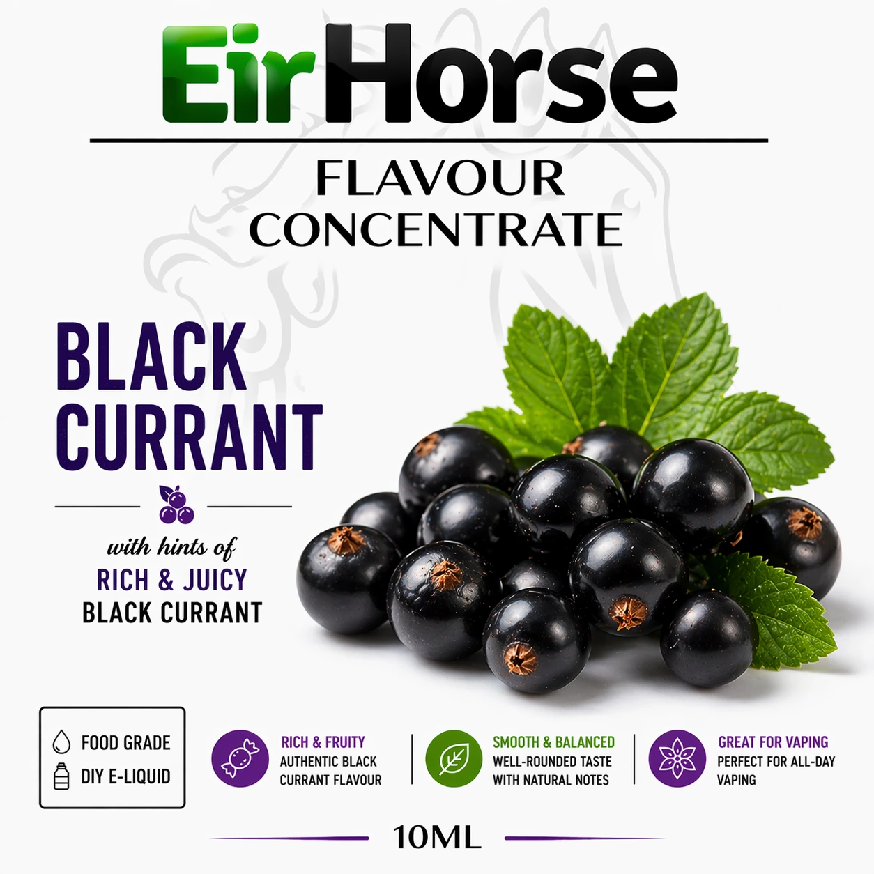 Eirhorse Black Currant Flavour Concentrate 10ml delivers a deep berry profile built around the naturally rich and slightly tart character of blackcurrant. The flavour is focused and clean, avoiding excessive sweetness while maintaining a full-bodied fruit presence.