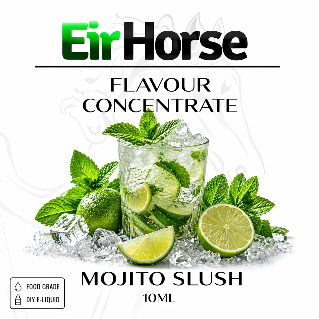 Eirhorse Mojito Slush Flavour Concentrate 10ml combines sharp lime citrus with fresh mint and a cooling slush effect. The profile is inspired by classic mojito drinks but enhanced with an icy finish, making it ideal for refreshing all-day mixes.