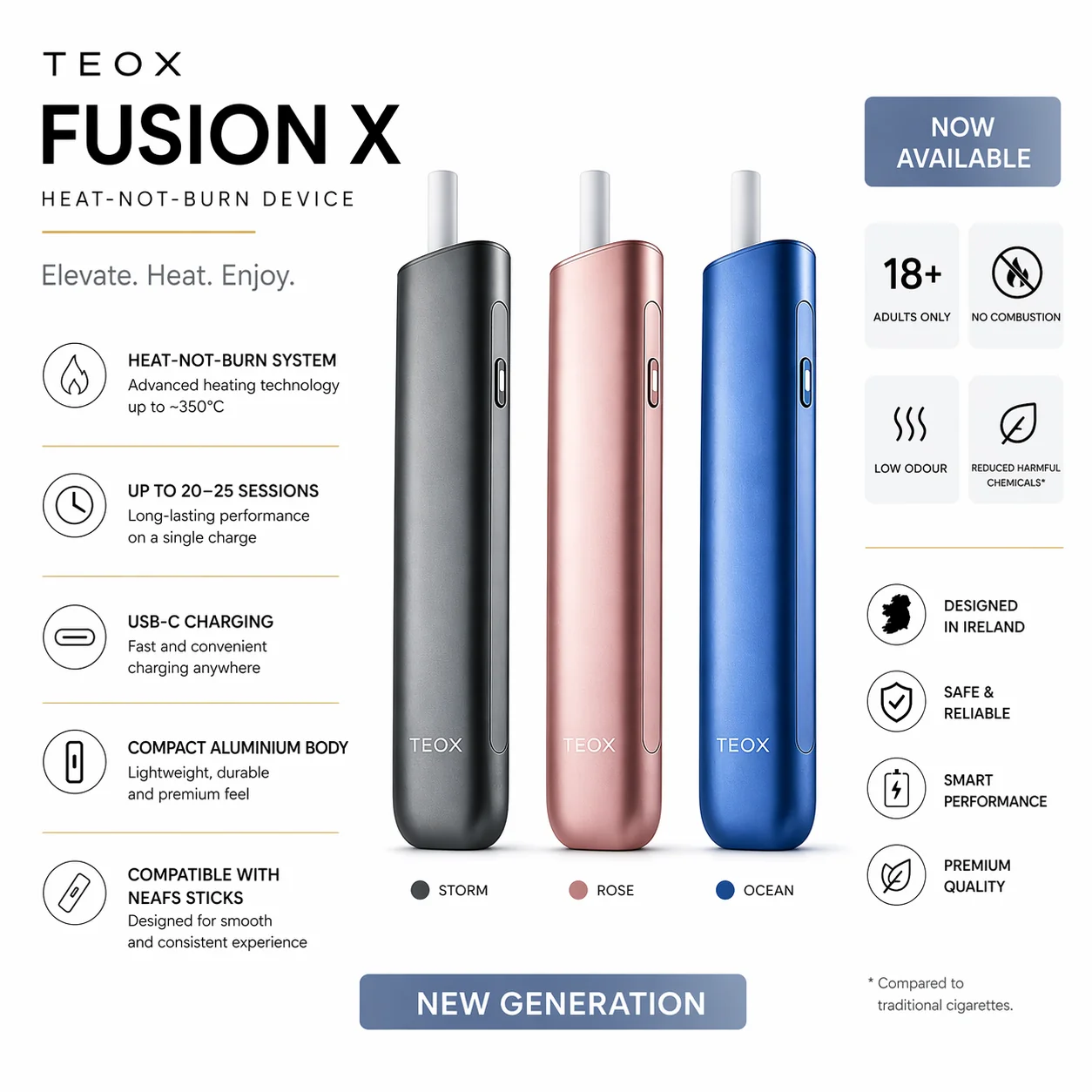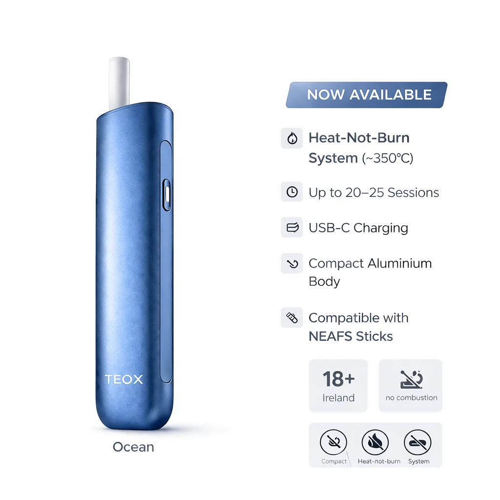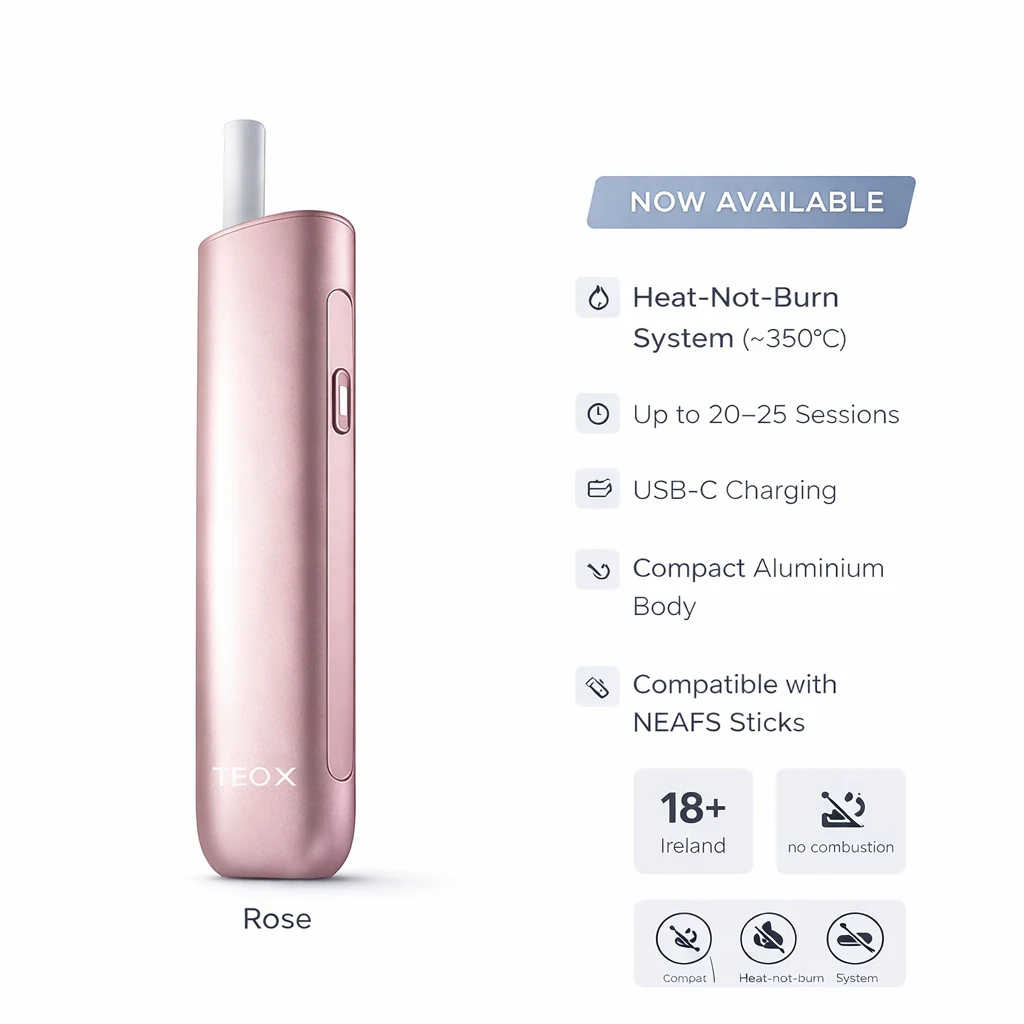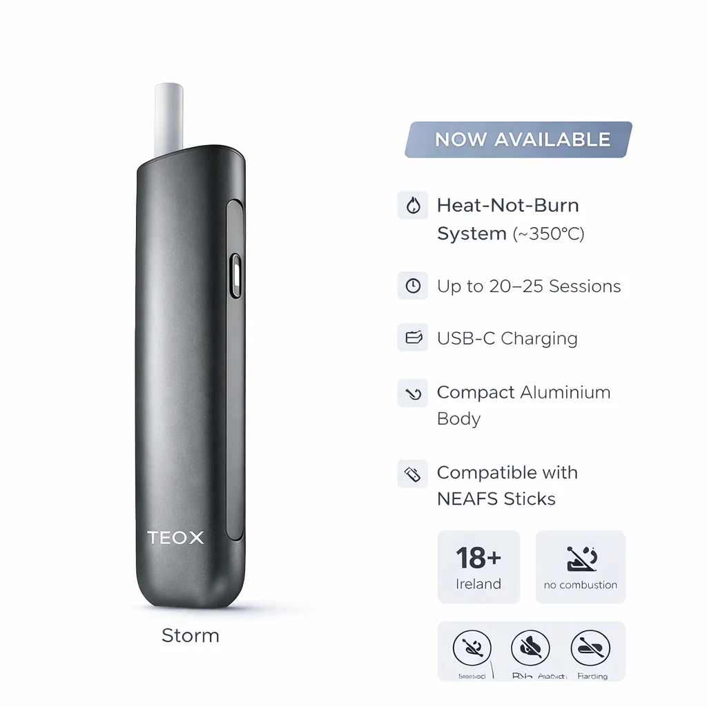 NEAFS TEO-X is a heat-based device designed for use with pre-formed sticks instead of e-liquid. The system releases aerosol through controlled heating rather than combustion, avoiding ash and open burning.