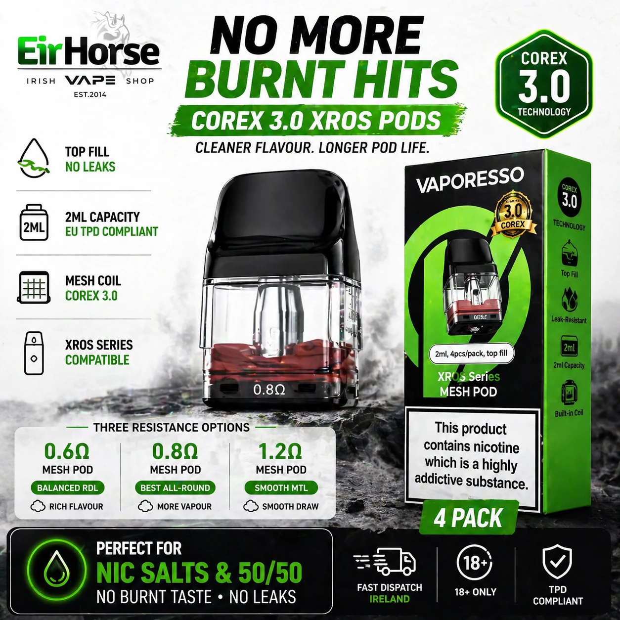 - 4 × Vaporesso refillable pods with integrated COREX 3.0 coil technology